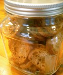 Crostini really are better made with stale bread, which is easier to slice very thinly. Drizzle the bread with a little olive oil and bake at 400 F until they are golden and crunchy (about 20 minutes). When I manage to rescue a few before they disappear into the Gaping Maw, I like them with really old cheddar and a dollop of curried raisin jelly.