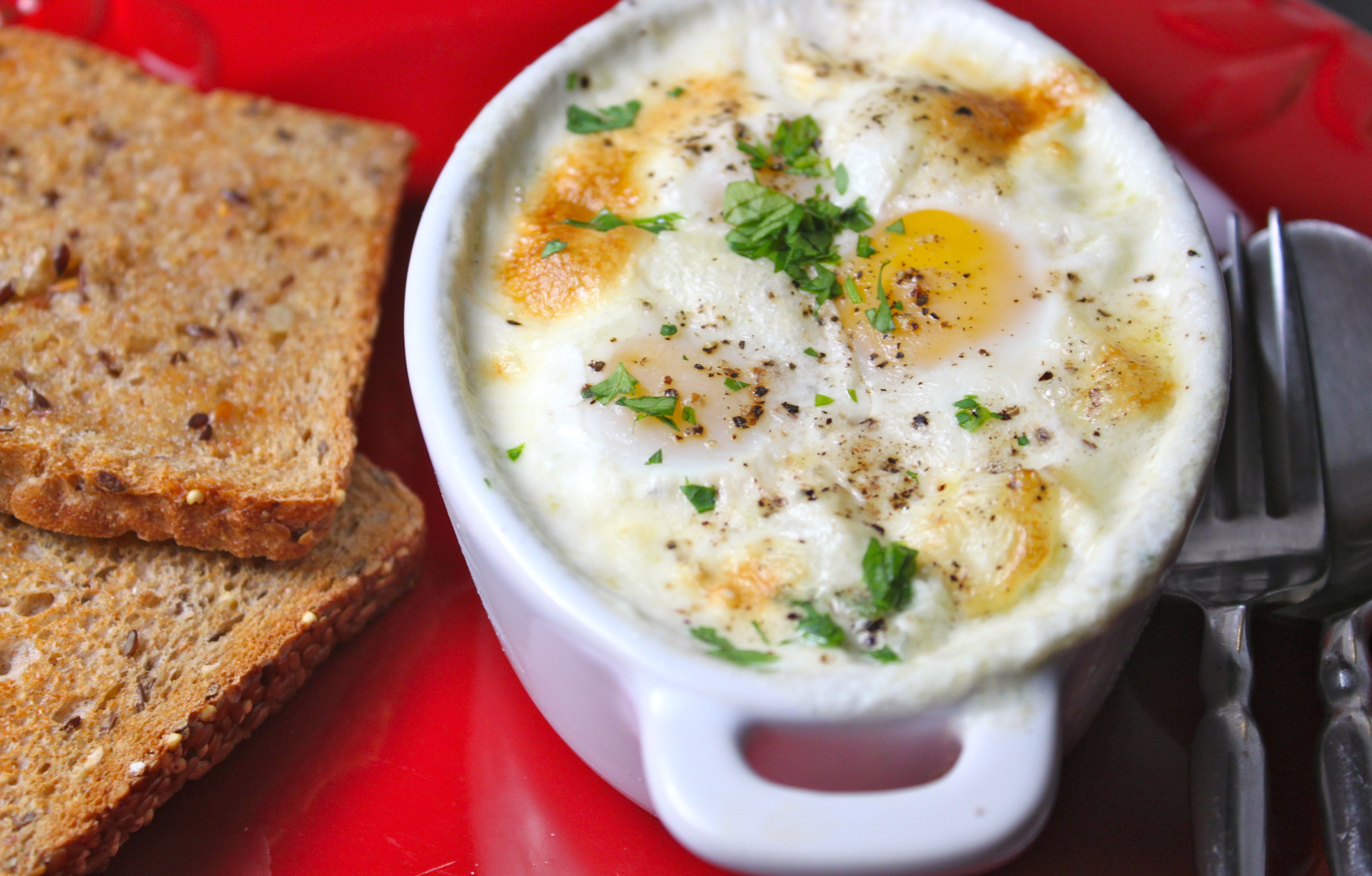2. Crack the egg into the middle of the dish. Add enough half-and-half to barely cover the white. Sprinkle with salt and coarsely ground pepper. Cook until the white is set, 8 to 12 minutes. Serve with grilled or toasted bread.