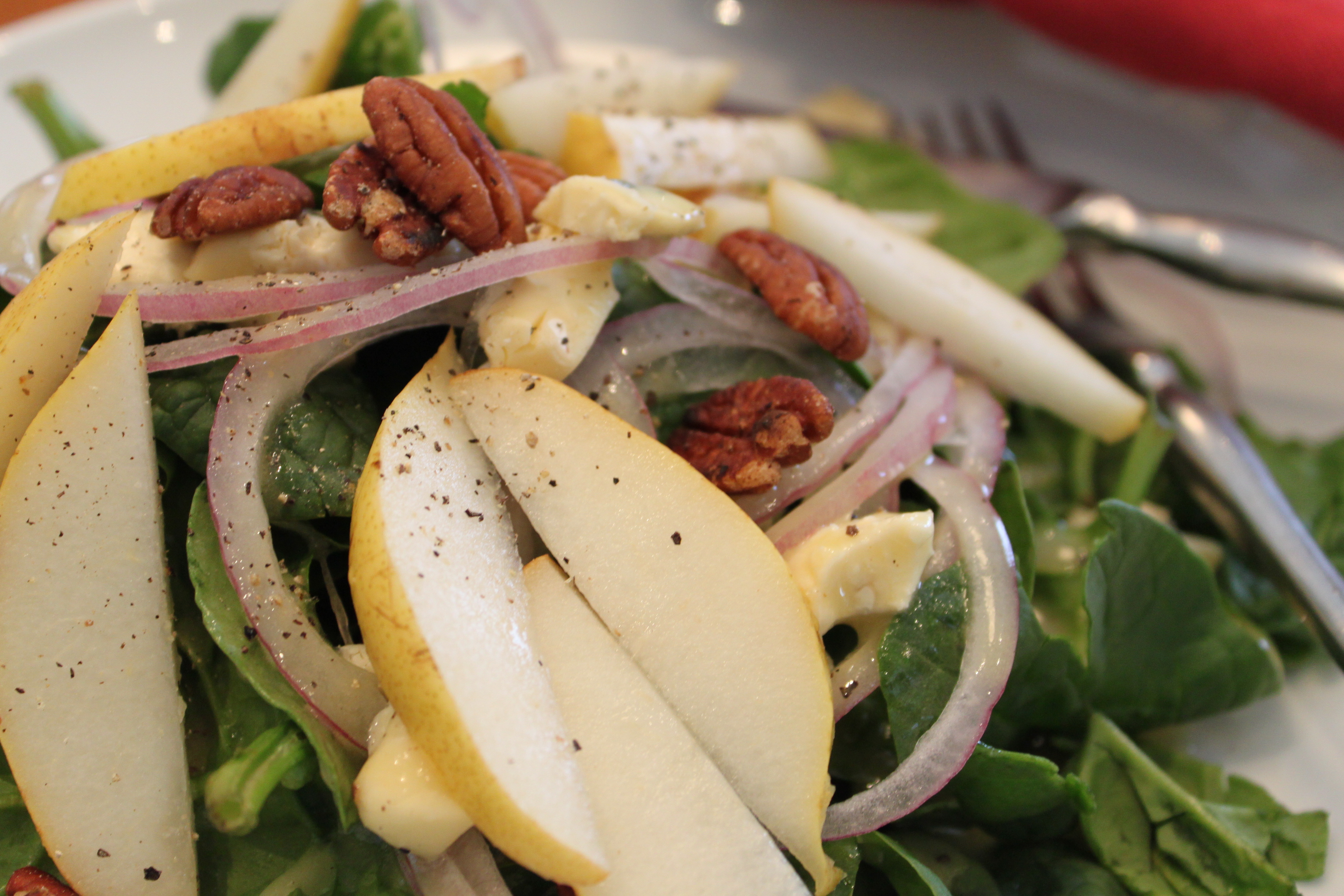 I wouldn’t say this is the lightest salad I’ve ever made, given it has nuts and cheese, but it was substantial enough for a dinner while green enough to be considered resolution compliant. The sweetness of toasted pecans compliments the bitter edge of the spinach (walnuts are also good) and pears and blue cheese always work well together. I used gorgonzola but any decent blue cheese would do.