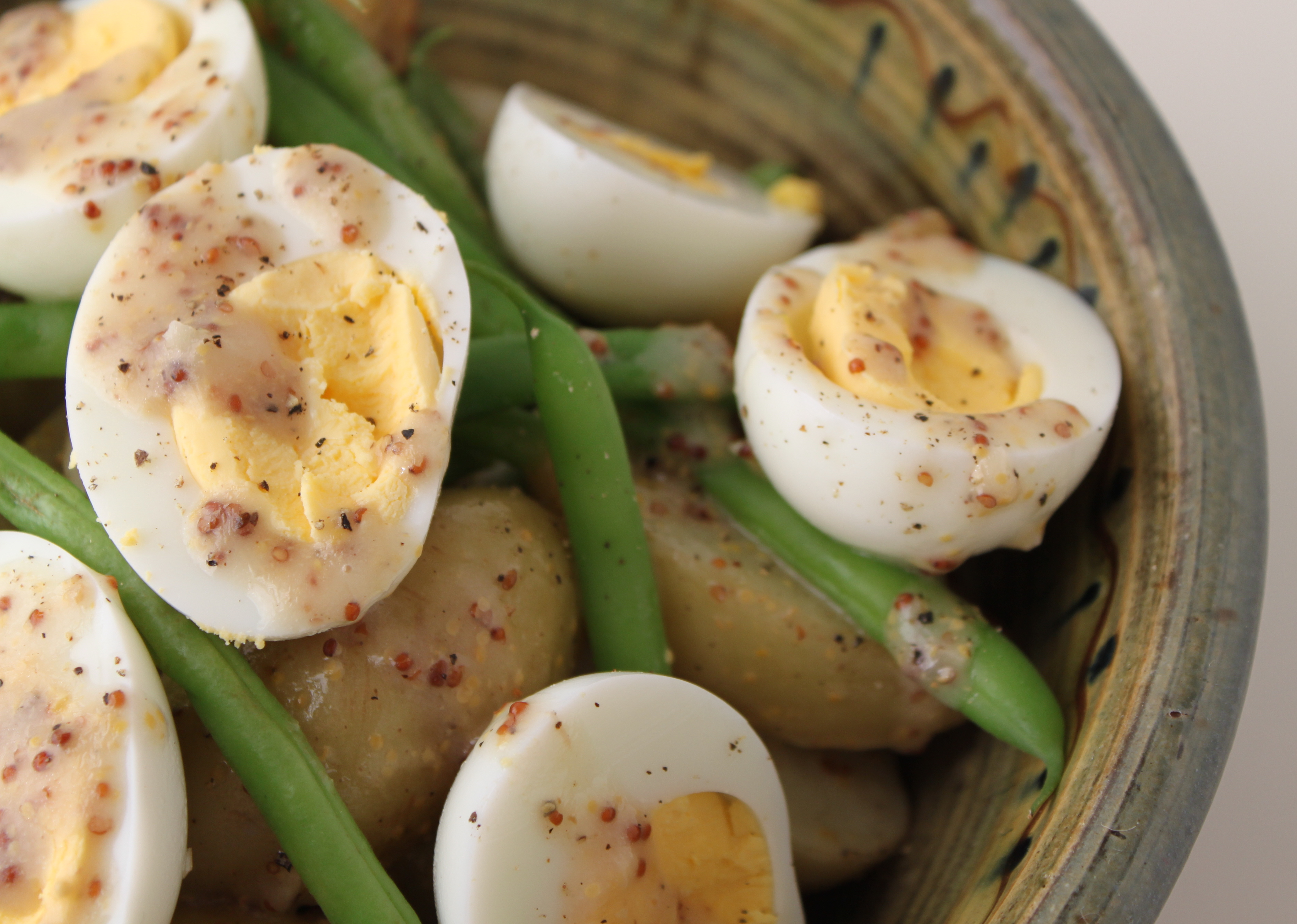 Toss the warm potatoes and green beans (be gentle) with the dressing and top with the sliced eggs.