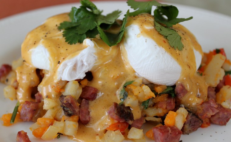 Eggs Benedict with chipotle Hollandaise sauce and Montreal smoked meat, two potato hash