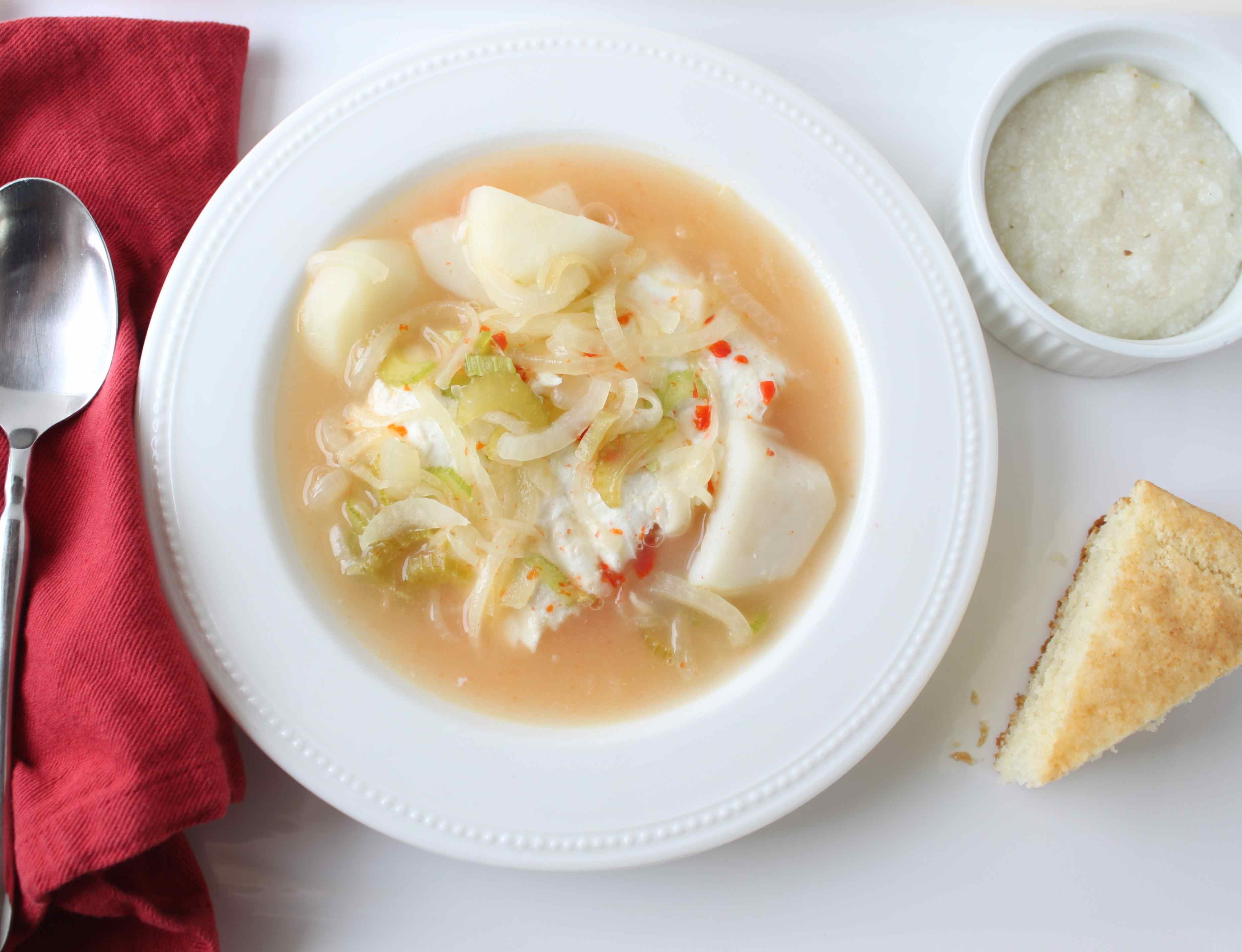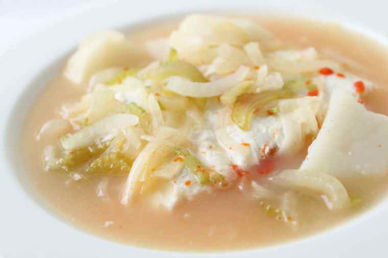 Boil the potatoes in the water and lime juice until they are almost tender (10-12 minutes). Meanwhile, sauté the onions and celery in a little oil until soft. When the potatoes are tender, reduce the heat so the broth is just below boiling and add the fish, hot pepper, onions and celery. Salt to taste and simmer until the fish is just cooked through (approx. 10 minutes). Enjoy with grits and johnny cake.
