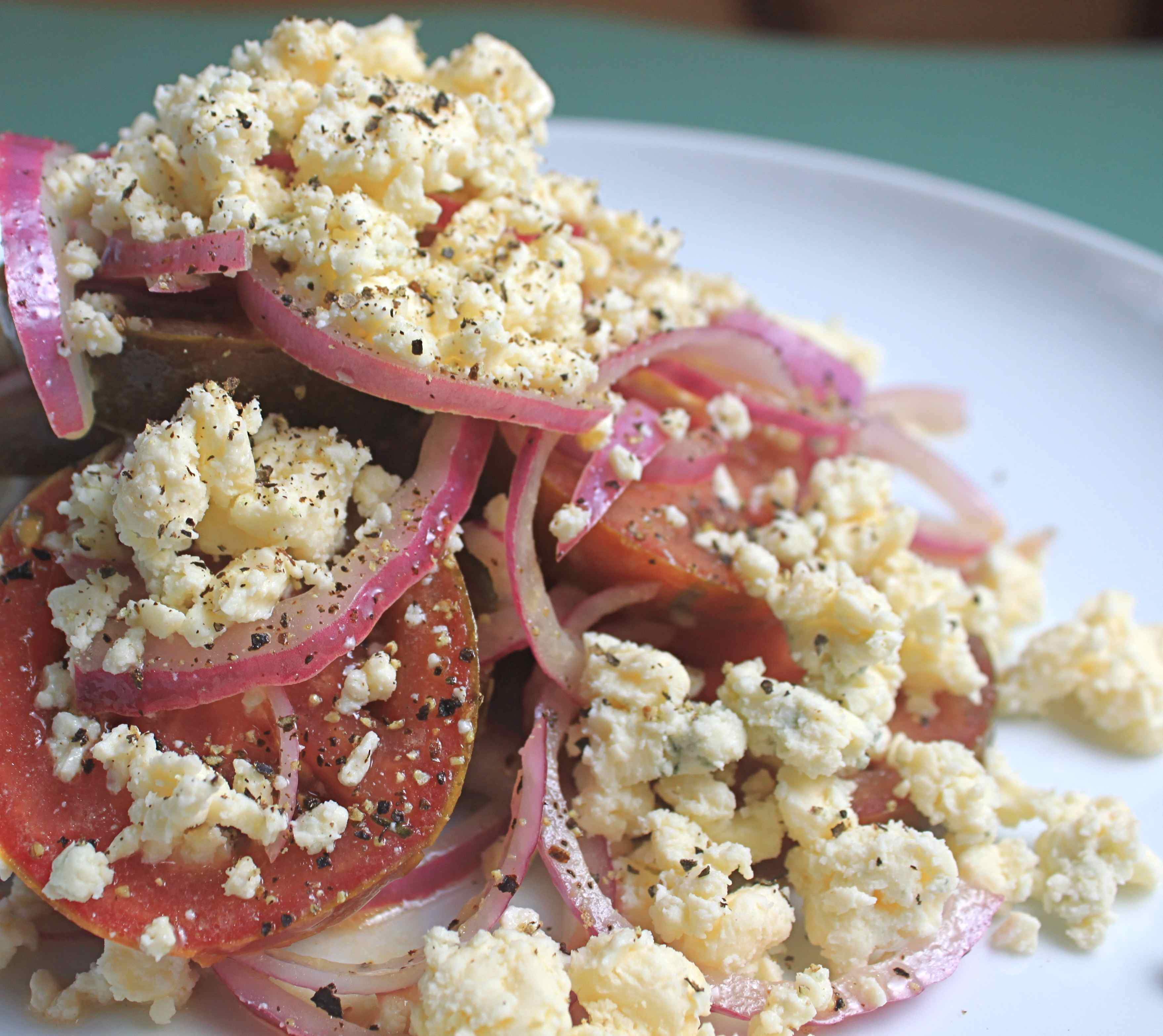 Beefsteak (or, Kumato), red onion and blue cheese salad