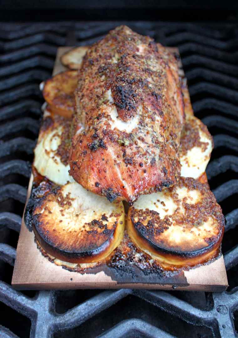 Place plank on the medium side of the grill and close lid. Cook for about 1-1/2 hours or, until a meat thermometer inserted into the middle of the roast reads 160 F.