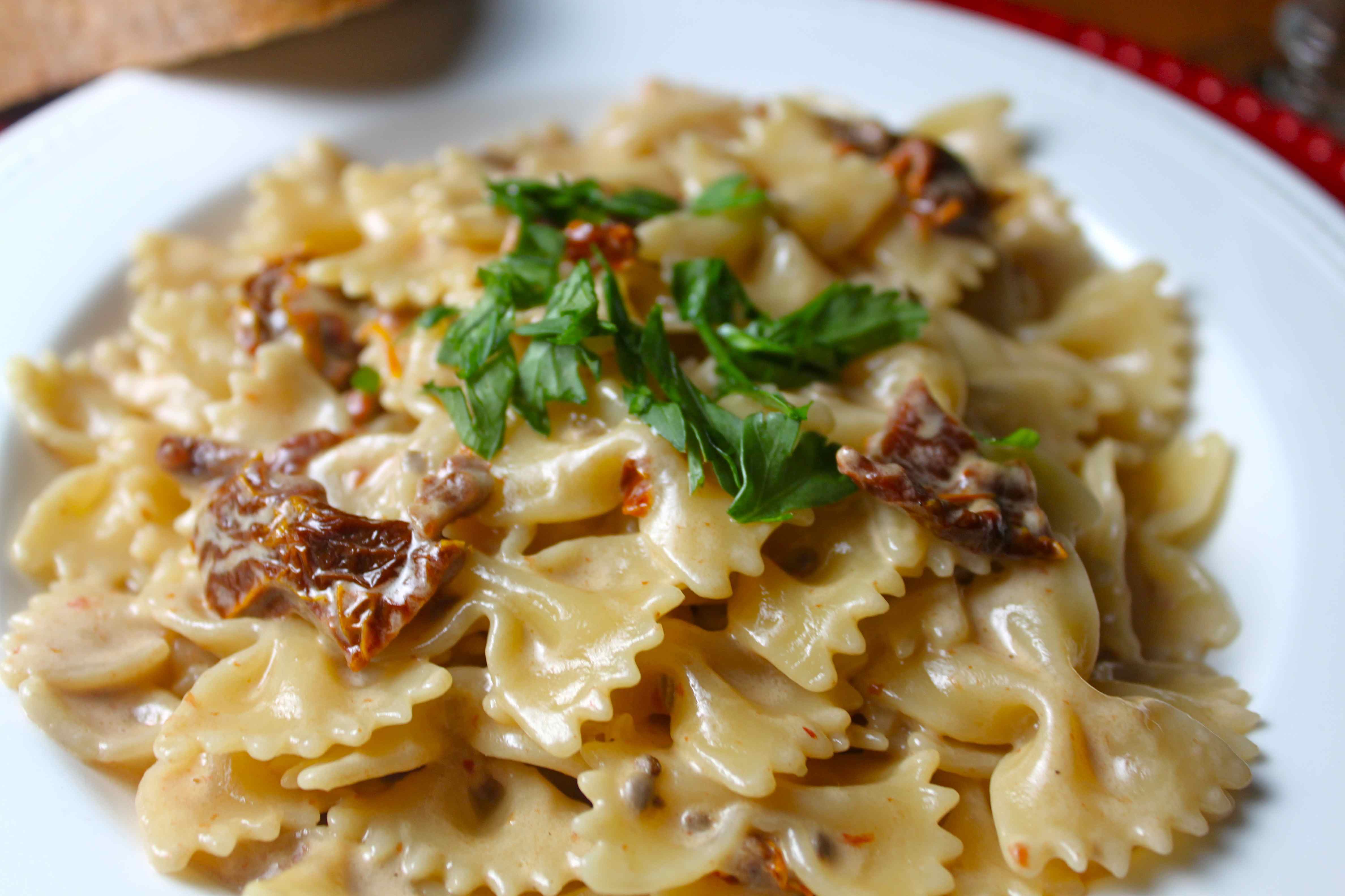 Here’s something to tide us all over until next October. It’s one of my favourite pasta dishes from one of my favourite restaurants. Intense sun-dried tomatoes add a real kick of flavour to this sauce that gets decadent by adding whipping cream and good dollop of brandy. The sauce is made even richer with lots of butter (it’s optional, but I always add it). This is so good with farfalle pasta.