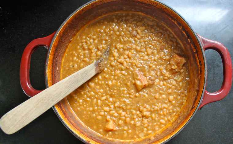Remove lid and reduce heat to 325 F. Bake beans for another 90 minutes or so until much of the liquid has evaporated and the beans have a saucy consistency.