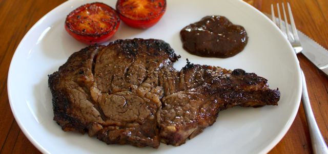 These days, I favour a more civilized pick-up-your-dirty-socks kind of bachelorhood (think English Country House rather than Frat House). Knives and forks enjoy full employment, beer is poured into glasses (or mugs if it happens to be breakfast), the empties neatly stacked out of sight. And, every steak, like the pan-fried beauty pictured above, has its sauce.